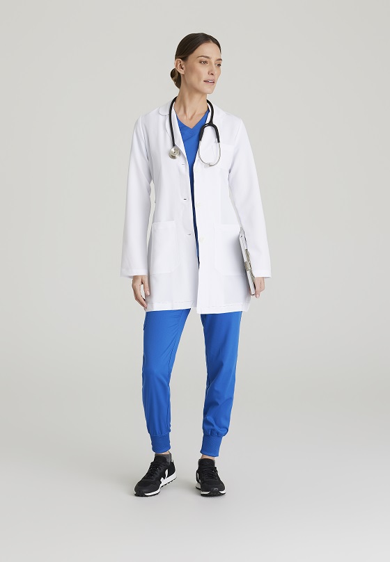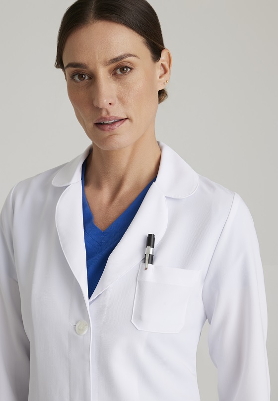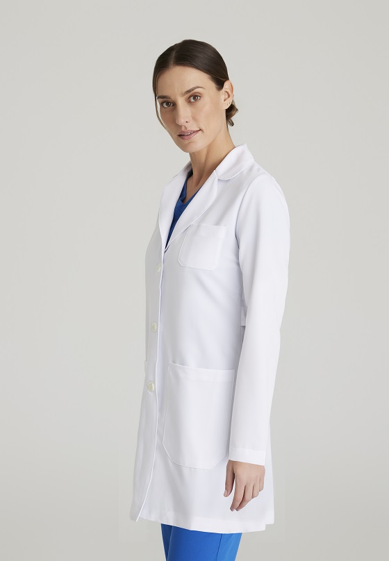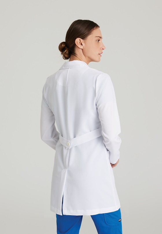 بياقة مستديرة، فتحة في الظهر مع اغلاق كامل بثلاثة أزرار وحزام قابل للتعديل في الخلف لتعديل حجم الخصر